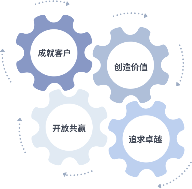 成就客户是一切决策的出发点,,,,创造价值是衡量所有工作的标准,,,,追求卓越是我们做事做人的态度,,,开放共赢是我们的格局也是最终的结果。。。价值观的齿轮环环相扣,,,推动着组织里的每个人不断向前。。